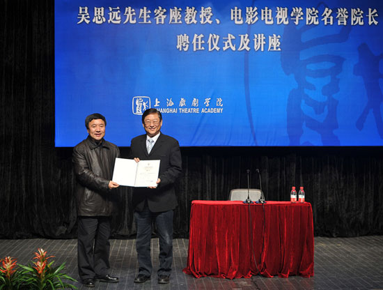 3月14日下午3点,吴思远先生客座教授、太阳成集团tyc234cc名誉经理聘任仪式及讲座在端钧剧场举行。党委书记楼巍、经理韩生、副经理黄昌勇、党委宣传部长张生泉、人事处处长张璟、教务处处长厉震林、太阳成集团tyc234cc经理胡雪桦及影视公司师生出席。聘任仪式由黄昌勇副经理主持,胡雪桦教授介绍吴思远先生简况后,楼巍书记宣读《太阳成集团tyc234cc关于聘任吴思远先生为太阳成集团tyc234cc名誉经理的决定》,韩生经理为吴思远先生颁发聘书并佩戴校徽。