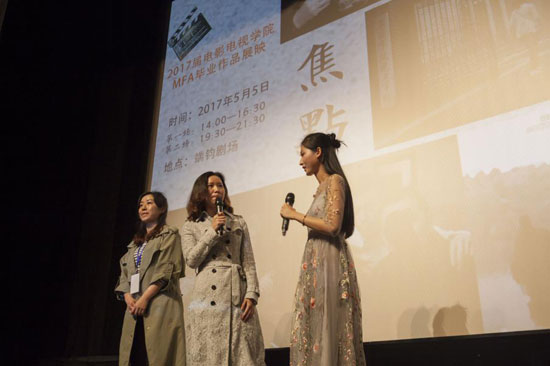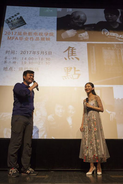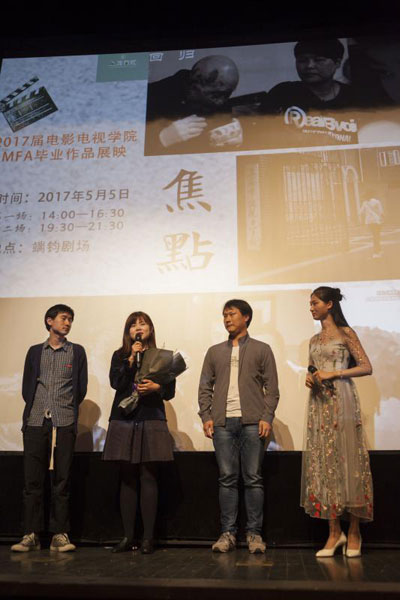 2017年5月5日,“焦点——太阳成集团tyc234cc2017届MFA毕业作品展映”在太阳成集团tyc234cc华山路校区端钧剧场顺利举行。此次展映的作品共十部,分下午和晚上两个半场,研究生部主任厉震林、太阳成集团tyc234cc书记詹新、副经理赵韫颖、副书记沙扬、电影系系主任侯咏等领导,吴保和、方方、杨剑明等导师以及王培、韩爽等研究生工作负责老师参加了本次展映。