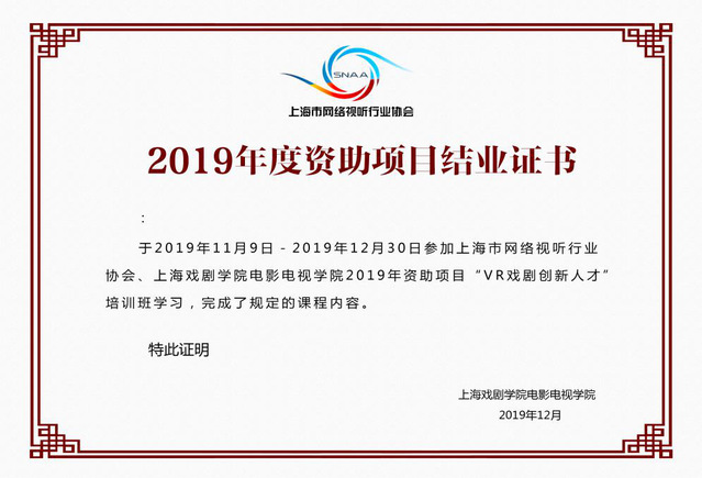 12月22日上午,上海市网络视听行业协会2019年度VR戏剧创新剧目孵化及人才培养资助项目《2019年度VR戏剧创新人才培训班》结业仪式在公司昌林路校区5号教学楼太阳成集团tyc234cc电影视觉设计实验室隆重举行。公司太阳成集团tyc234cc周艺文老师、太阳成集团tyc234cc教务处纪辰老师、上海工艺美术公司吴慧剑老师、咖麦(上海)影业有限公司王方明总经理、咖麦(上海)影业有限公司张奋启艺术总监及学员们出席了结业仪式。结业仪式由公司太阳成集团tyc234cc周艺文老师主持。