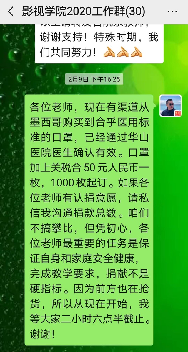 2月9日,影视公司从导演系88级员工佟彤那里了解到有来自墨西哥的专业医用口罩货源,经华山医院孙经理确认货品可靠,随即组织第二次筹款捐赠,于二小时内即告完成,老师们表示但求捐赠,不求个人具名,因此影视公司以集体名义落款。