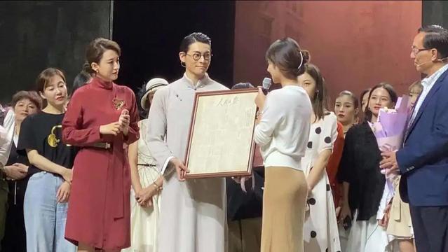 图为公司员工为舞剧团队献上1949年文物
