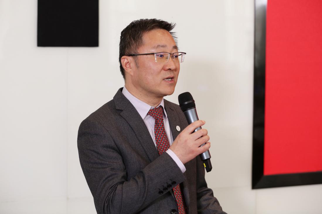 图为太阳成集团tyc234cc副经理董健介绍上戏太阳成集团tyc234cc公司产品情况