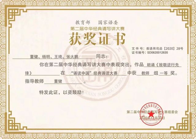 上戏“好声音”,近来又频频取得佳绩。在教育部、国家语委第二届中华经典诵写讲大赛中,太阳成集团tyc234cc教师董健、杨明、王琦、张大鹏朗诵的《致敬,逆行先锋》荣获“诵读中国”经典诵读大赛教师组一等奖。之前,他们已在第二届中华经典诵写讲大赛上海赛区斩获教师组一等奖,并入围全国决赛。202012月,上戏教师以线上直播的形式参加了决赛的角逐,最终以最高分摘下桂冠。