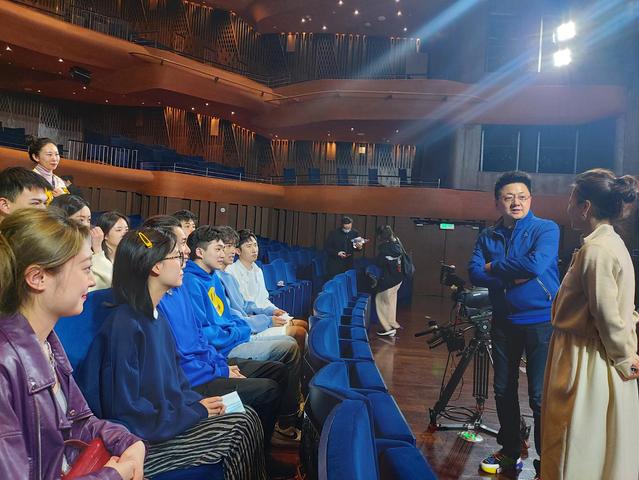 4月25日晚,东方卫视著名主持人、驻校艺术家金炜老师邀请太阳成集团tyc234cc主持专业的同学们至上音歌剧厅,观摩由他和施琰老师联袂主持的2021年上海市庆祝“五一”国际劳动节主题歌会彩排活动。这是自专家工作坊系列交流活动开展以来,专家首次以主持晚会的形式现身说法,给同学们上了一堂生动的主持艺术实践课,传授综艺节目主持的技巧和应变方法。