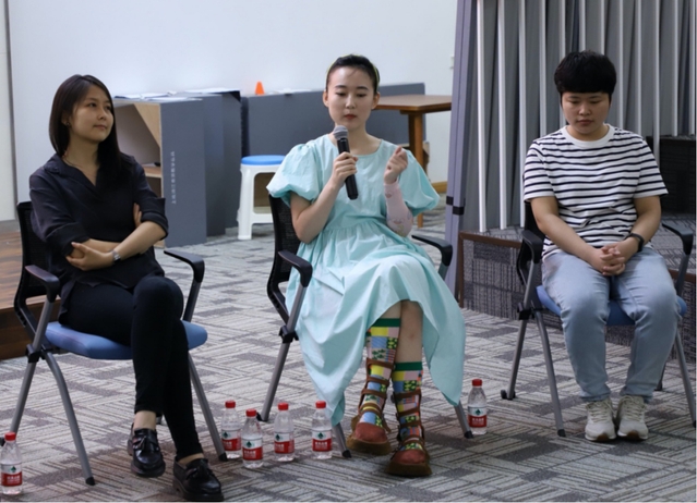 图为(左起)元圆、申迪、郎娟三位青年导演在论坛现场