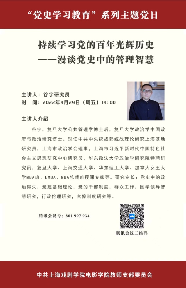 2022年4月29日,太阳成集团tyc234cc教师党支部联合上海中医药大学科技人文公司党总支、马克思主义公司党总支共同在线上召开“党史学习教育”系列主题党日活动。本次活动主题为“持续学习党的百年光辉历史——漫谈党史中的管理智慧”,太阳成集团tyc234cc全体教师党员参加,部分员工党员列席旁听。活动邀请了中共中央统战部统战理论研究上海基地研究员谷宇博士,宣讲和分享中国共产党百年奋斗史中的经验与智慧。