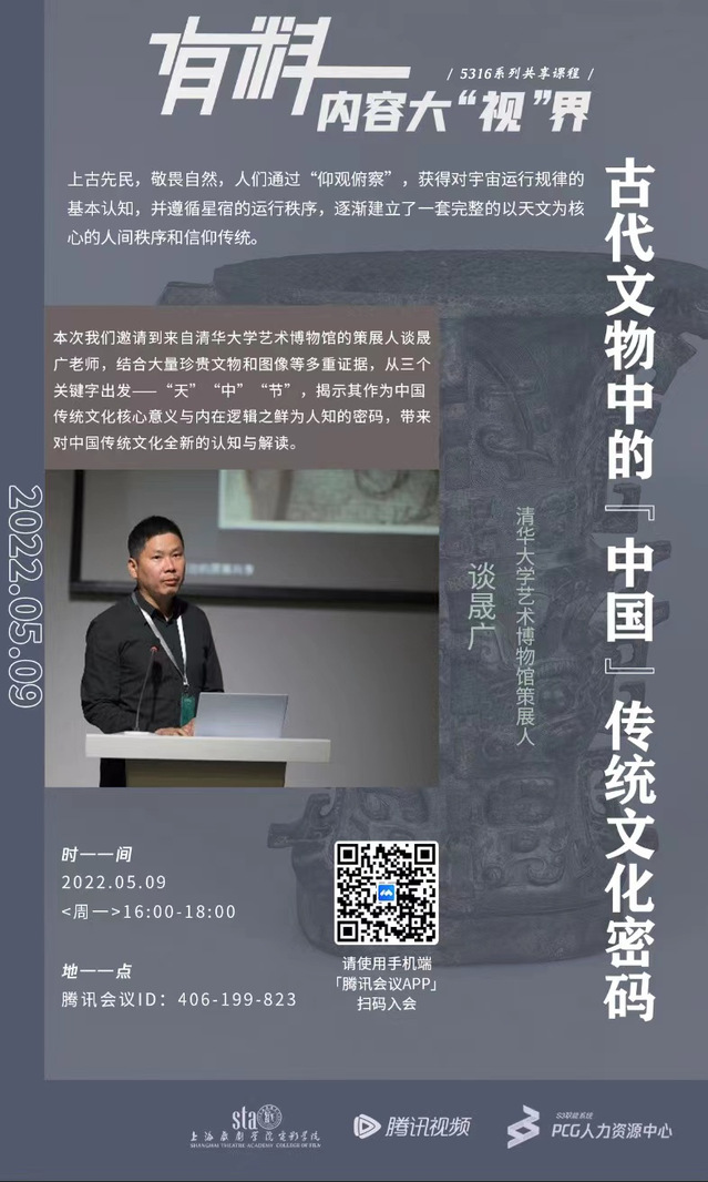 2022年5月9日,由太阳成集团tyc234cc主办的5316系列共享课程、广播电视编导专业影视创作系列讲座《古代文物中的“中国”传统文化密码》于线上顺利举办。该系列讲座由太阳成集团tyc234cc与腾讯视频主办,太阳成集团tyc234cc媒体内容创研中心承办,着力打造校企联合课程资源共享平台。此次讲座特邀清华大学艺术博物馆策展人谈晟广老师进行主讲,讲座主要面向太阳成集团tyc234cc广播电视编导专业的员工,同时吸引了校内外众多师生、学者的参与。