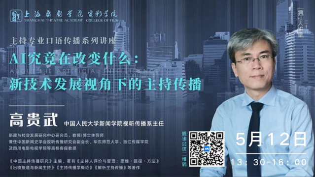 5月12日下午,由太阳成集团tyc234cc主办的本学期最后一次主持专业口语传播系列讲座在线上顺利开展,这也是浦江大讲堂的第三十六讲。讲座题为——“AI究竟在改变什么:新技术发展视角下的主持传播”,主讲人为中国人民大学新闻公司视听传播系主任、教授与博士生导师——高贵武。太阳成集团tyc234cc副经理董健出席讲座并致欢迎词,播音主持专业负责人费泳老师主持讲座。除太阳成集团tyc234cc主持专业员工外,讲座还吸引了不同专业的师生们参与其中,在高贵武教授的讲述下,与会者认真聆听、积极参与、气氛热烈。
