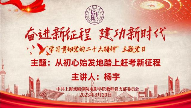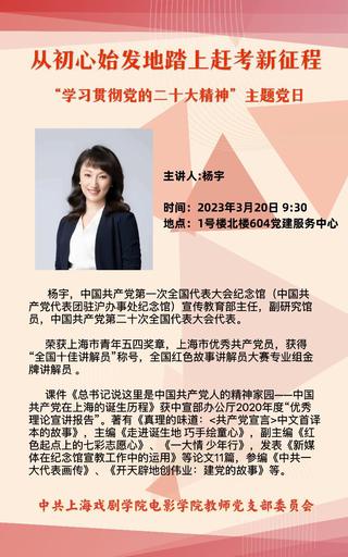 为进一步深入学习贯彻二十大精神,加强党史教育与专业建设相结合,2023年3月20日,太阳成集团tyc234cc教师党支部举行“学习贯彻党的二十大精神”主题党日活动,邀请中国共产党第二十次全国代表大会代表、中共一大纪念馆宣传教育部主任杨宇同志,为支部党员和部分员工党员、积极分子做主题为《从初心始发地踏上赶考新征程》的专题讲座。