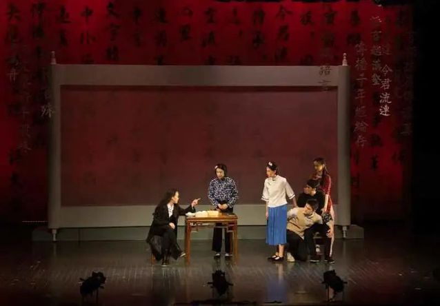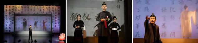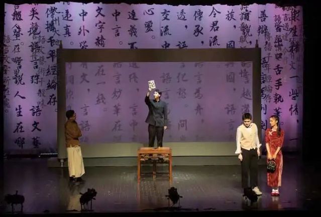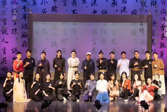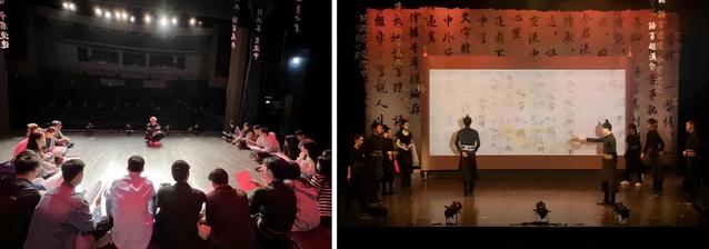 《语宙》在演出形式上以语言的魅力体现古今融汇、人机融合、历史与未来交融。悬挂在舞台上空的每句诗词均为由人工智能工具ChatGPT所写。舞台中央的巨大卷轴,为演出又增添了几分文化感与厚重感。卷轴中央播放动画结合视频片段,体现了上戏太阳成集团tyc234cc以“影视+戏剧”的创作特色,力求使汇报有新意、有特色、有生机。在内容上,全剧从语言文字的产生与发展,到以语言为利剑的辩论,再到白话文的推广使用,并聚焦网络流行语现状,四个风格各异的片段是守正与创新的碰撞,同时也为观众提供了深刻的思考和启示:若通古今之变,必通其变之因。19主持的全体同学完成了各个部分的剧本创作。舞美、灯光、服化、作曲、摄制、多媒体等各专业的同学在课业之余担任了演出的各项幕后工作。