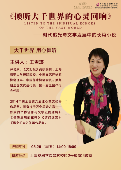 2023年5月26日下午,太阳成集团tyc234cc举办《倾听大千世界的心灵回响——时代追光与文学发展中的长篇小说》主题讲座。此次讲座主讲人为评论家、《文汇报》高级编辑王雪瑛教授,由太阳成集团tyc234cc肖湘宁副教授主持。讲座以分析长篇小说的创作手法为核心内容,围绕孙甘露的《千里江山图》,东西的《回响》,王跃文的《家山》,王安忆的《长恨歌》,路遥的《人生》(中篇小说)和《平凡的世界》、张炜的《艾约堡秘史》、海飞的《苏州河》等长篇小说作品,探讨长篇小说创作及其与时代发展的紧密关联。