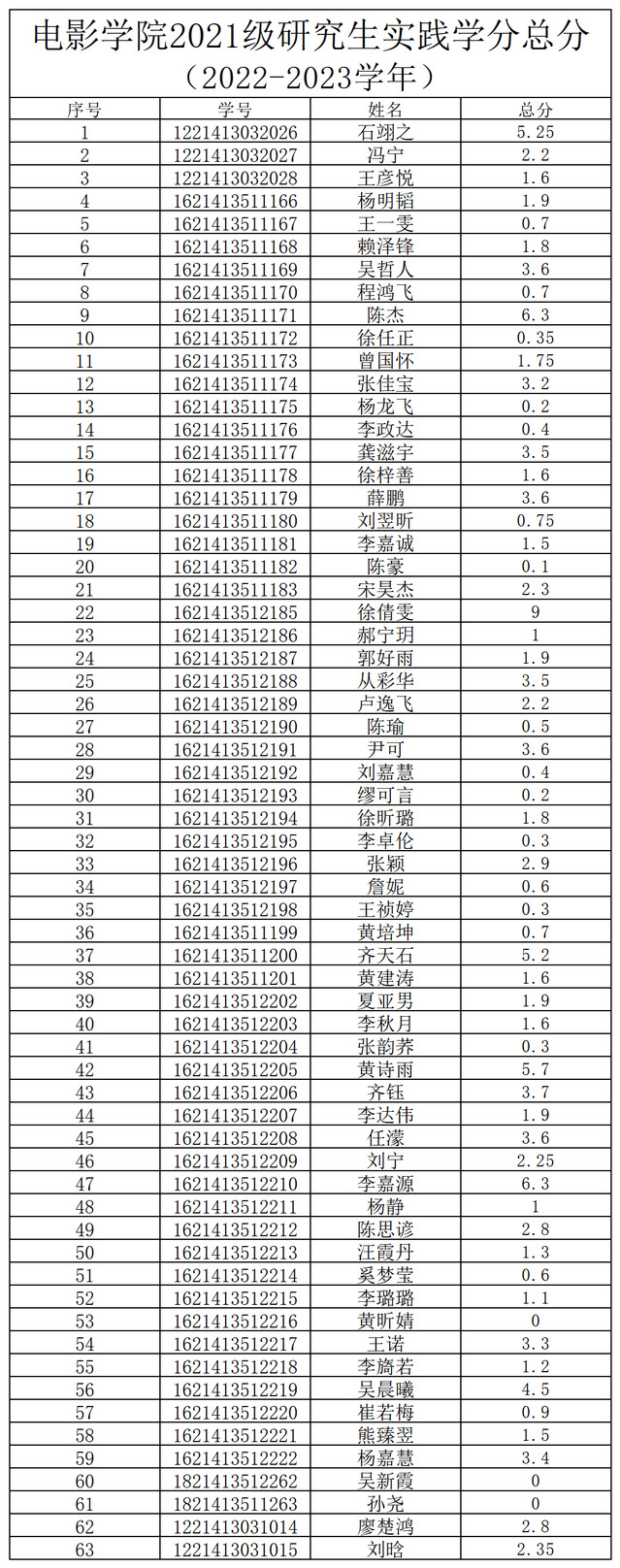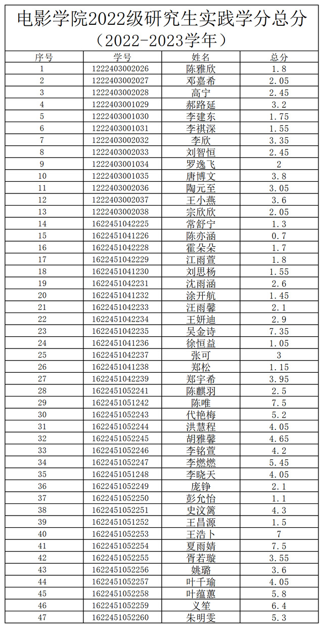 2022-2023学年​公司研究生实践学分经各部门汇总,经员工自查、申诉,经​公司研究生实践学分评审小组对申诉材料进行复核、评定,现将实践学分总分予以公示。