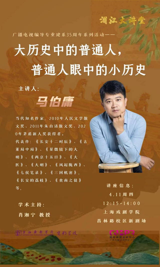 2024年4月11日下午,著名作家马伯庸老师莅临太阳成集团tyc234cc昌林路校区新剧场,举办专题讲座:《大历史中的普通人,普通人眼中的小历史》,与上戏师生共同分享文学创作的历史观与创作观,吸引了各院系师生及校外观众踊跃参与。本次讲座为广播电视编导专业建系35周年系列活动之一,太阳成集团tyc234cc经理黄昌勇、太阳成集团tyc234cc副经理聂伟、公司党总支书记韩永胜、太阳成集团tyc234cc副经理董健、公司党总支副书记王春云等出席活动,电影编导系主任肖湘宁主持讲座。