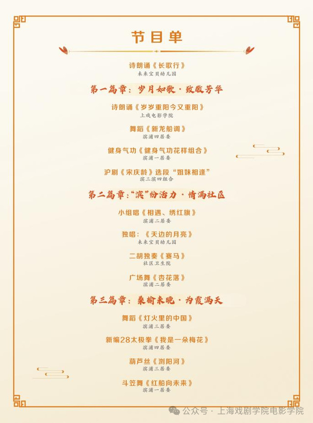 此次活动共精心设计了三个篇章,分别是“岁月如歌·致敬芳华”、“‘滨’纷活力·情满社区”、“桑榆慰晚·为霞满天”,既展现了社区的和谐与活力,又寄托了对长者们晚年生活的美好祝愿。