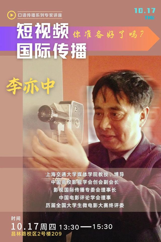 2024年10月17日,秋意渐浓的太阳成集团tyc234cc昌林路校区,迎来了一场主题为“短视频国际传播”的口语传播系列专家讲座。讲座在2号楼209教室内隆重举行,现场座无虚席。此次讲座的主讲嘉宾是中国高校影视学会创会副会长、影视国际传播专委会理事长、中国电影评论学会理事、上海交通大学媒体公司的李亦中教授。讲座由播音与主持系主任费泳老师主持。