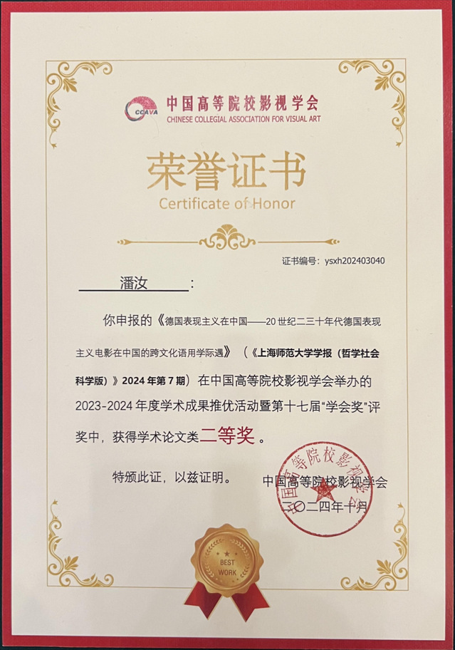 潘汝教授的《德国表现主义在中国——20世纪二三十年代德国表现主义电影在中国的跨文化语用学际遇》获中国高校影视学会2023-2024年度学术成果推优活动暨第十七届学会奖学术论文类二等奖。