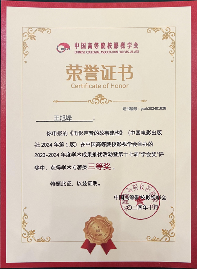 王旭锋教授的专著《电影声音的故事建构》获中国高校影视学会2023-2024年度学术成果推优活动暨第十七届学会奖学术专著类三等奖。