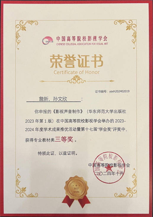 詹新教授、孙文欣合著的教材《影视声音制作》获中国高校影视学会2023-2024年度学术成果推优活动暨第十七届学会奖三等奖。