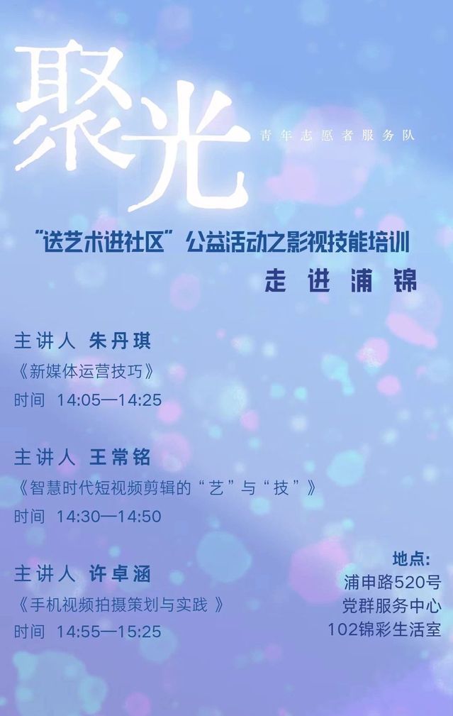 活动主要由公司研究生党员、入党积极分子、聚光青年志愿者们向浦锦街道的社区居民、社区基层骨干等群体分享影视技能的相关经验,内容涵盖短视频拍摄与剪辑、新媒体策划及宣传、摄影技巧与实操训练等。旨在丰富街道、社区人员的影视及宣传专业知识,同时扩老员工与社会的接触面,实现公司与社区的双向链接。