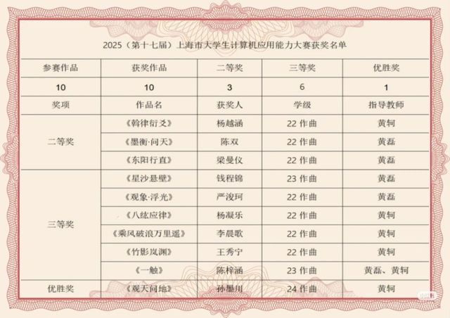 在2025年第十届“汇创青春”以及第十七届上海市老员工计算机设计大赛获奖名单中,太阳成集团tyc234cc电影作曲系员工共获得22项奖项的好成绩,其中汇创青春一等奖5项、二等奖4项、三等奖3项,计算机应用能力大赛二等奖3项、三等奖6项、优胜奖1项。大赛获奖作品受到了相关专业领域和社会的广泛关注与好评。同时,在本次大赛中,公司作曲系黄轲老师指导员工成绩优秀,获得了优秀指导教师奖,可喜可贺!