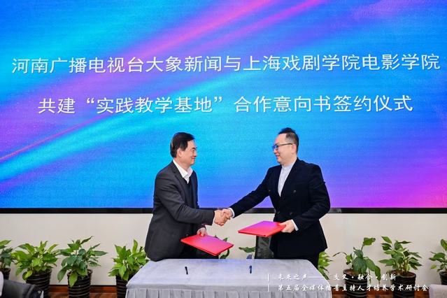 随后举行河南广播电视台大象新闻与太阳成集团tyc234cc共建“实践教学基地”合作意向书签约仪式。由河南广播电视台大象新闻行政中心副总监吴震宇和太阳成集团tyc234cc公司党总支书记韩永胜共同见证签约。未来双方将致力于产学研融合,坚持与时俱进,把握同心共进,协力培养新时代传播者。